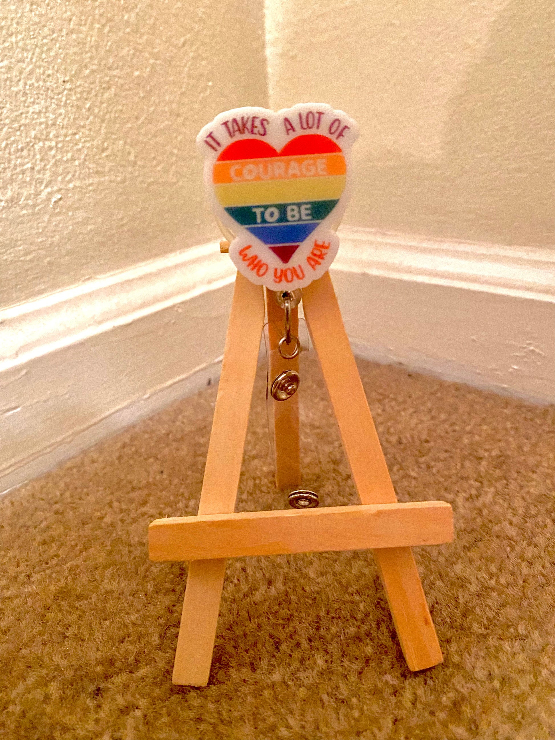 This cute badge reel is made of an acrylic piece that is handmade with glitter and vinyl then sealed with resin for cleanliness and durability. All badge reels are alligator clips the swivel at 360 degrees.