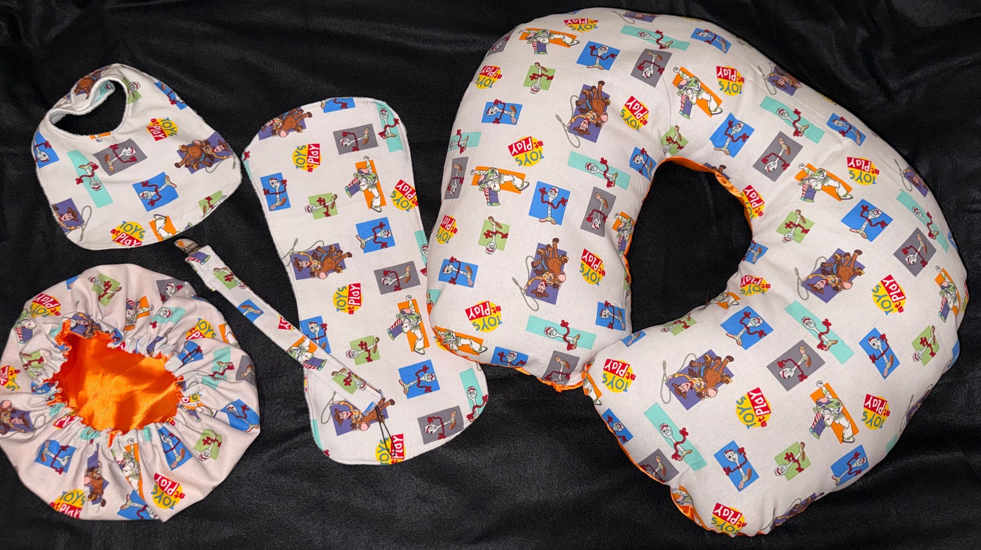 Toy Story Inspired Luxury Baby Gift Set | Reversible Satin Bonnet, Bib, Burp Cloth, Pacifier Holder & Boppy Pillow Cover